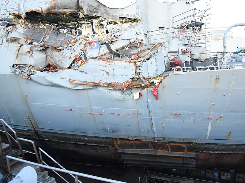 Dimensiunile şi o construcţie mai solidă au prevenit scufundarea celor două distrugătoare de tip „Arleigh Burke” implicate în 2017 în accidente similare. În special la USS „John S. McCain” putem observa gaura de apă destul de mare: